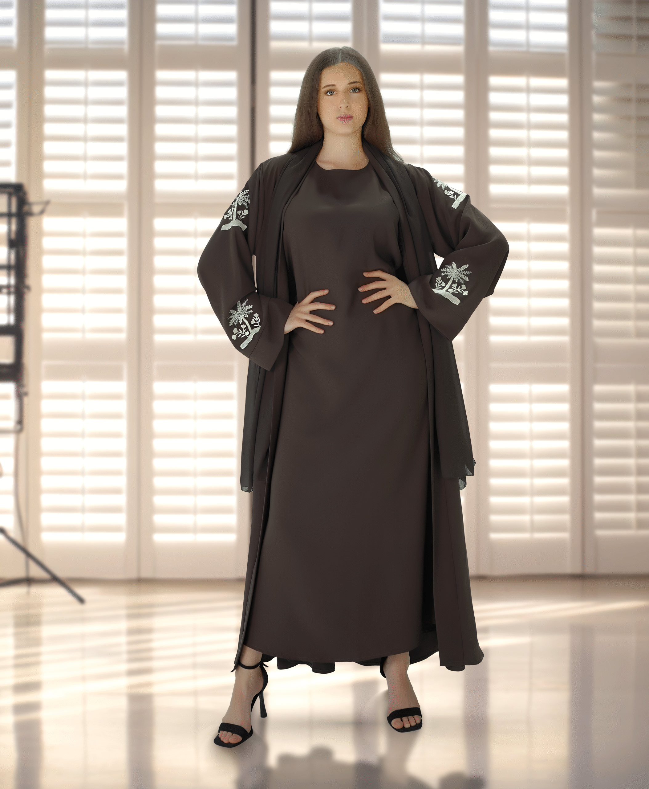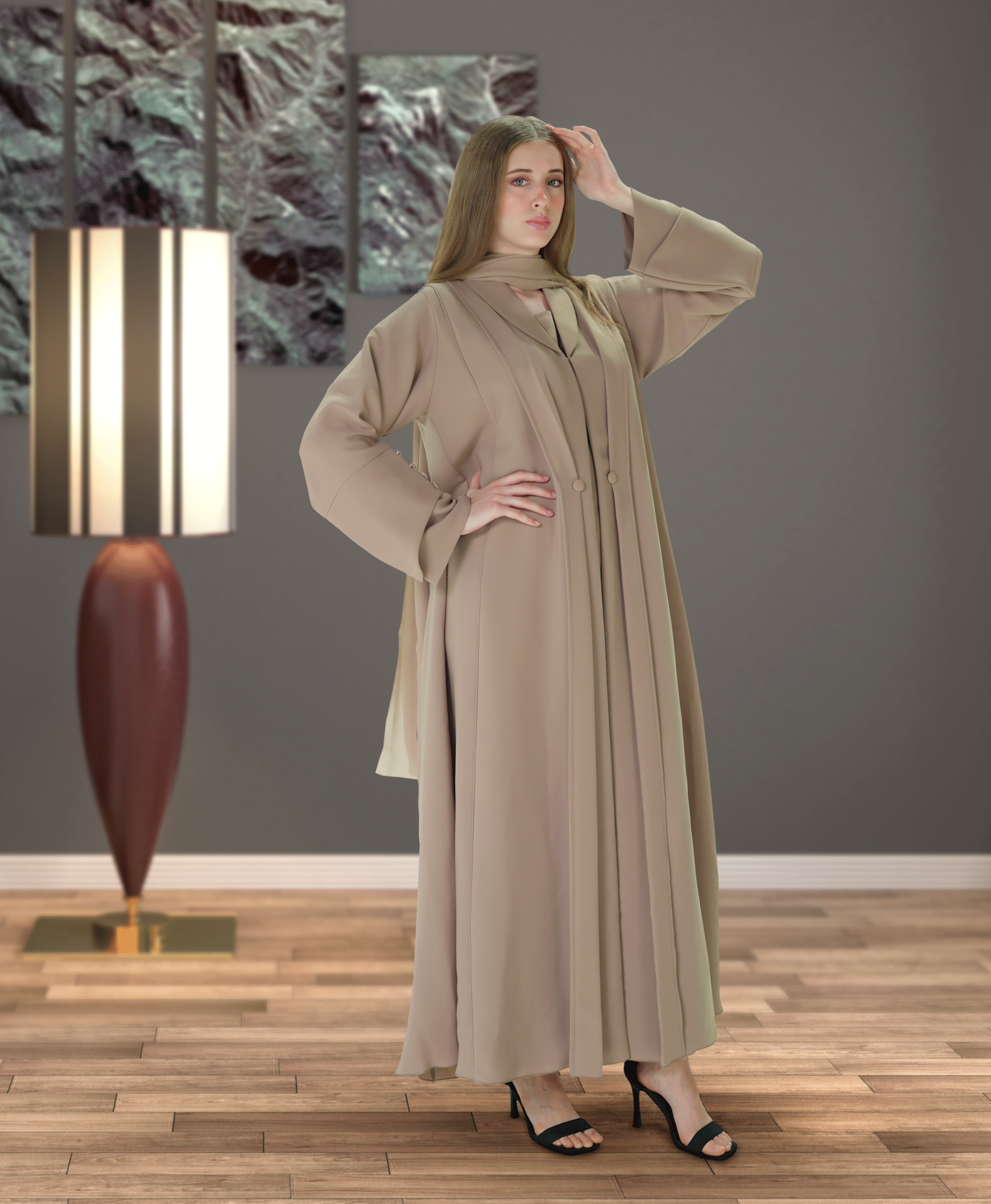 Classic black abaya with intricate golden details. A top choice for formal events in UAE or Pakistan. Set of 2: Abaya & Matching Sheila Fabric: Chiffon Color: Beige Garment Care: Dry Clean Duration: 10-12 business days