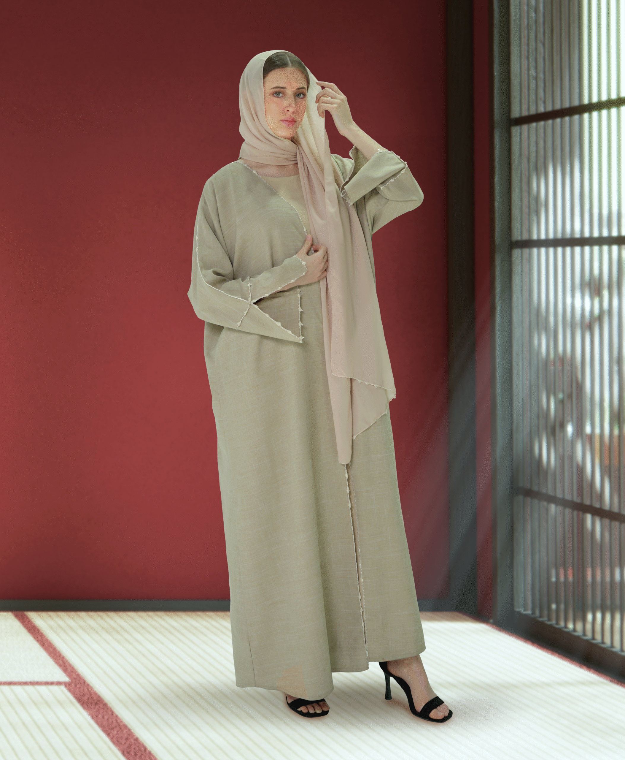 Deep green nida abaya with elegant gold piping. Ideal for evening wear in UAE and Pakistan